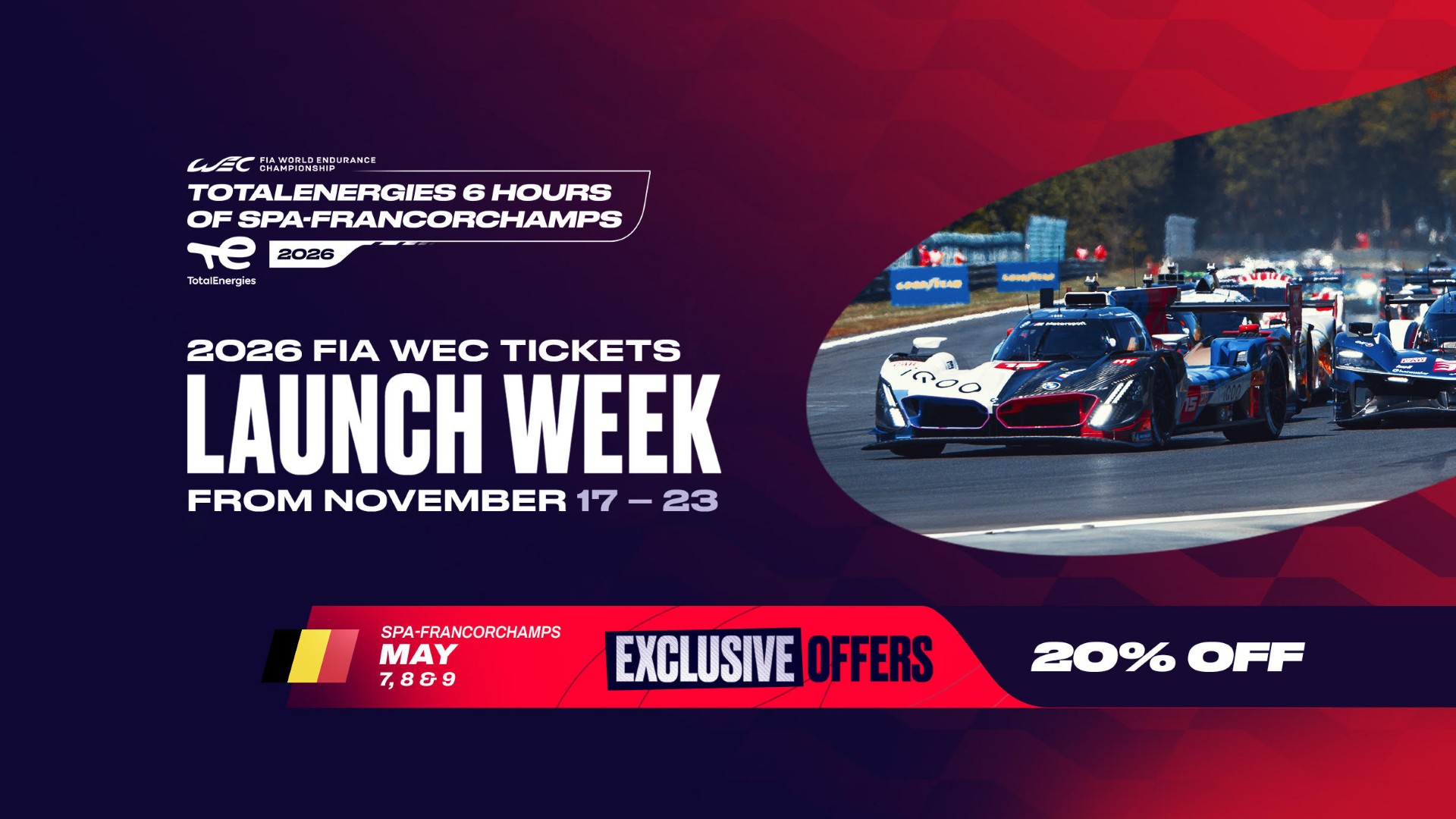 Pendant la Launch Week (17–23 novembre 2025), des billets à prix réduits sont proposés aux fans. Une belle manière d’anticiper leur venue sur les circuits en 2026, et pourquoi pas prévoir quelques cadeaux sous le sapin de Nöel. Ne manquez pas l’occasion d’assister aux TotalEnergies 6 Hours Spa-Francorchamps, où les meilleurs pilotes du monde vous donnent rendez-vous pour une course une nouvelle fois palpitante ! Une seule adresse à retenir : https://www.ticketmaster.be/artist/...